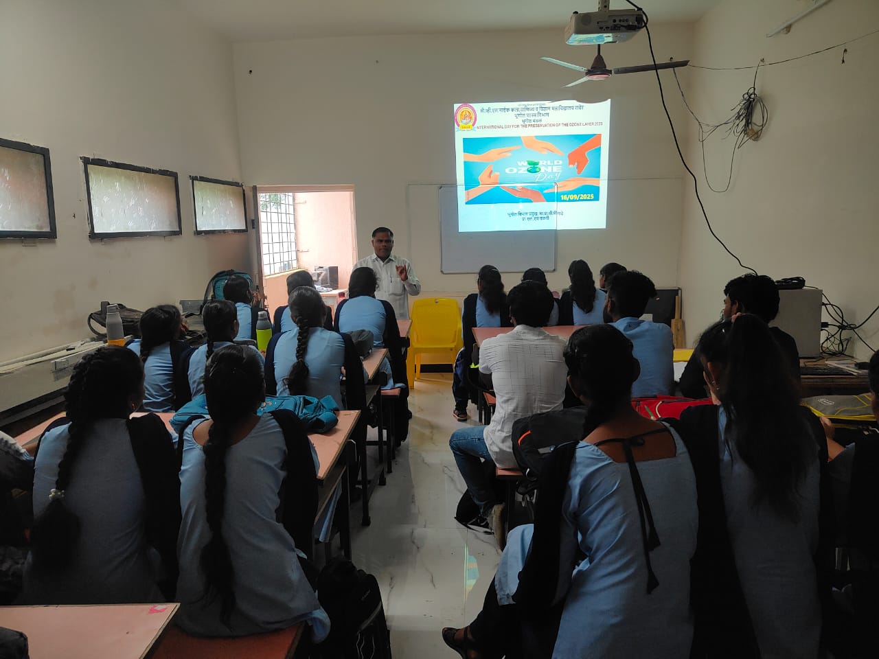 कार्यक्रमाचे अध्यक्ष भूगोल विभाग प्रमुख प्रा.सी.पी. गाढे यांनी विद्यार्थ्यांना ओझोन दिनाविषयी अनमोल मार्गदर्शन केले. सरांनी ओझोन म्हणजे काय,ओझोन क्षयाची कारणे व परिणाम, उपाययोजना, त्याचप्रमाणे व्हीएण्णा कन्वेंशन व मॉन्टेरियल प्रोटोकॉल आणि कीगाली अमेंडमेंट याविषयी विद्यार्थ्यांना मार्गदर्शन करून स्थानिक व वैयक्तिक पातळीवर हरितगृह वायूंचे उत्सर्जन कमी कसे करता येईल यावर माहिती दिली.