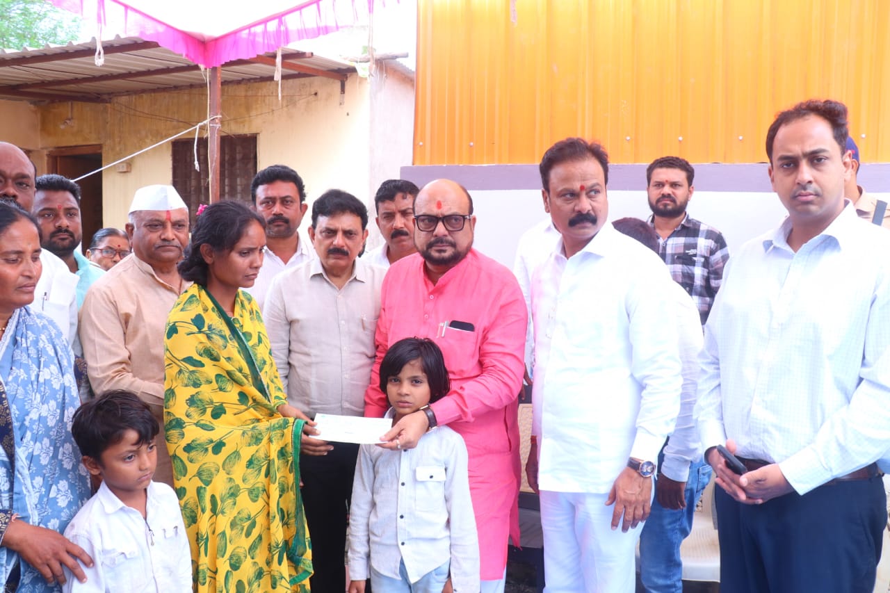 अतिवृष्टीमुळे शेती पिकांचे नुकसान झालेल्या शेतकऱ्यांना शासनातर्फे सर्वोतोपरी  मदत -पुराच्या पाण्यात मयत झालेल्या किरण सावळे, यांच्या कुटुंबाकडे   शासनातर्फे चार लाख रुपयांचा धनादेश सुपूर्त